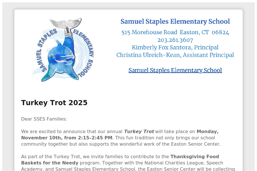 Turkey Trot 2025 Dear SSES Families: We are excited to announce that our annual Turkey Trot will take place on Monday, November 10th, from 2:152:45 PM . This fun tradition not only b. . .