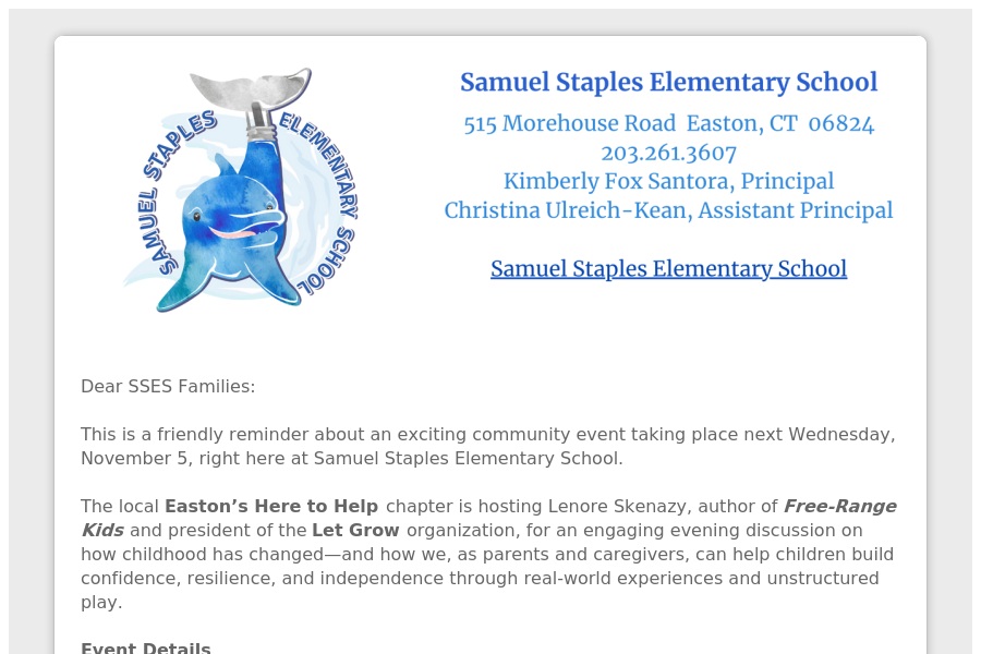 Dear SSES Families: This is a friendly reminder about an exciting community event taking place next Wednesday, November 5, right here at Samuel Staples Elementary School. The local Eastons He. . .